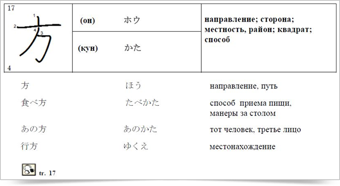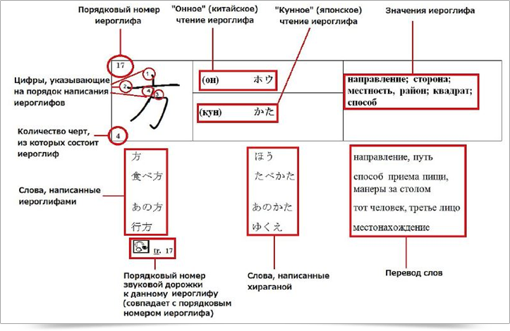 Иероглифы, их значения и слова даются в следующем виде: